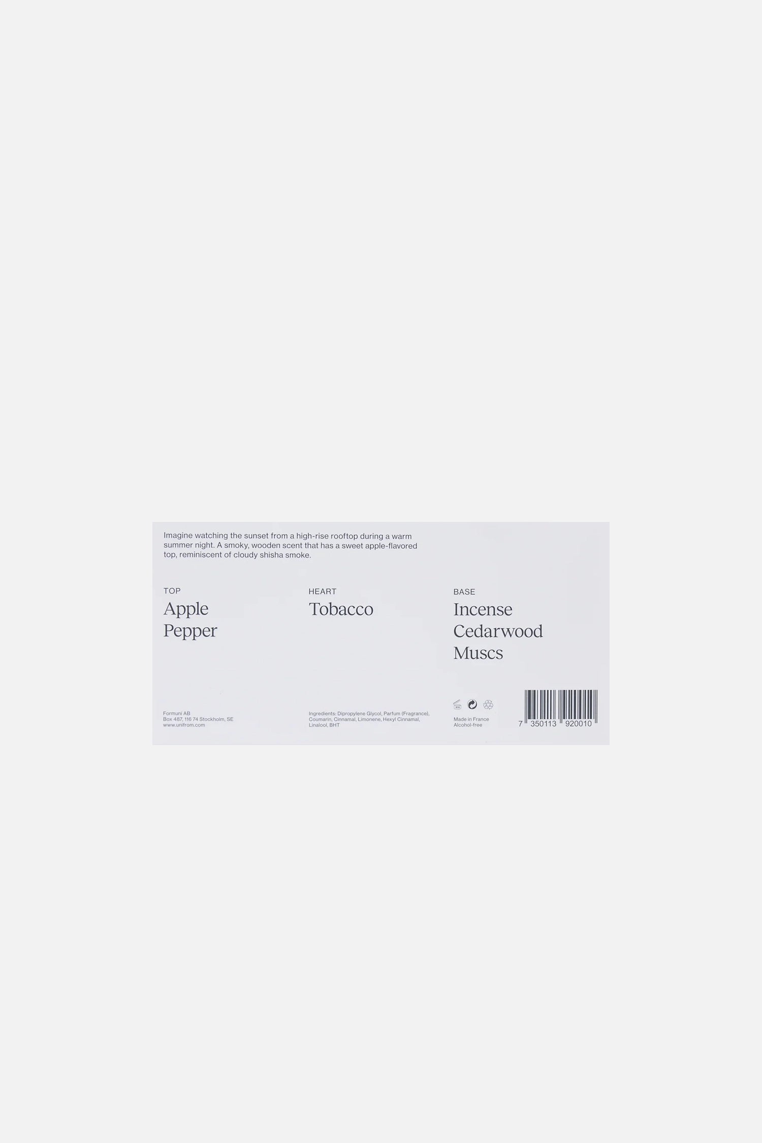 Imagine contemplar la puesta de sol desde la azotea de un rascacielos en una cálida noche de verano. Una fragancia ahumada y amaderada con un toque de manzana dulce, que recuerda al humo turbio de la chicha.