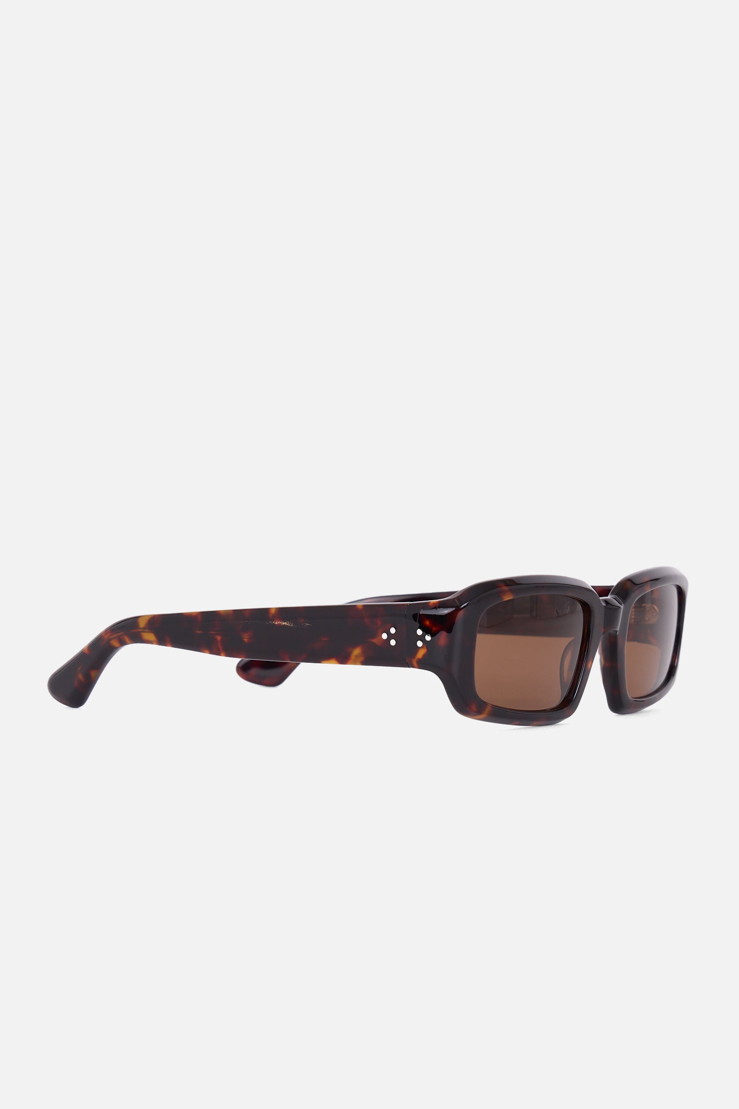 Monture carrée Conçue pour une coupe unisexe confortable Fabriquées à la main au Japon en acétate de cellulose Protection à 100 % contre les UVA/UVB Rivets emblématiques en acier à six pointes Dimensions : Verre : 53 mm. Pont : 23 mm. Branche : 140 mm.